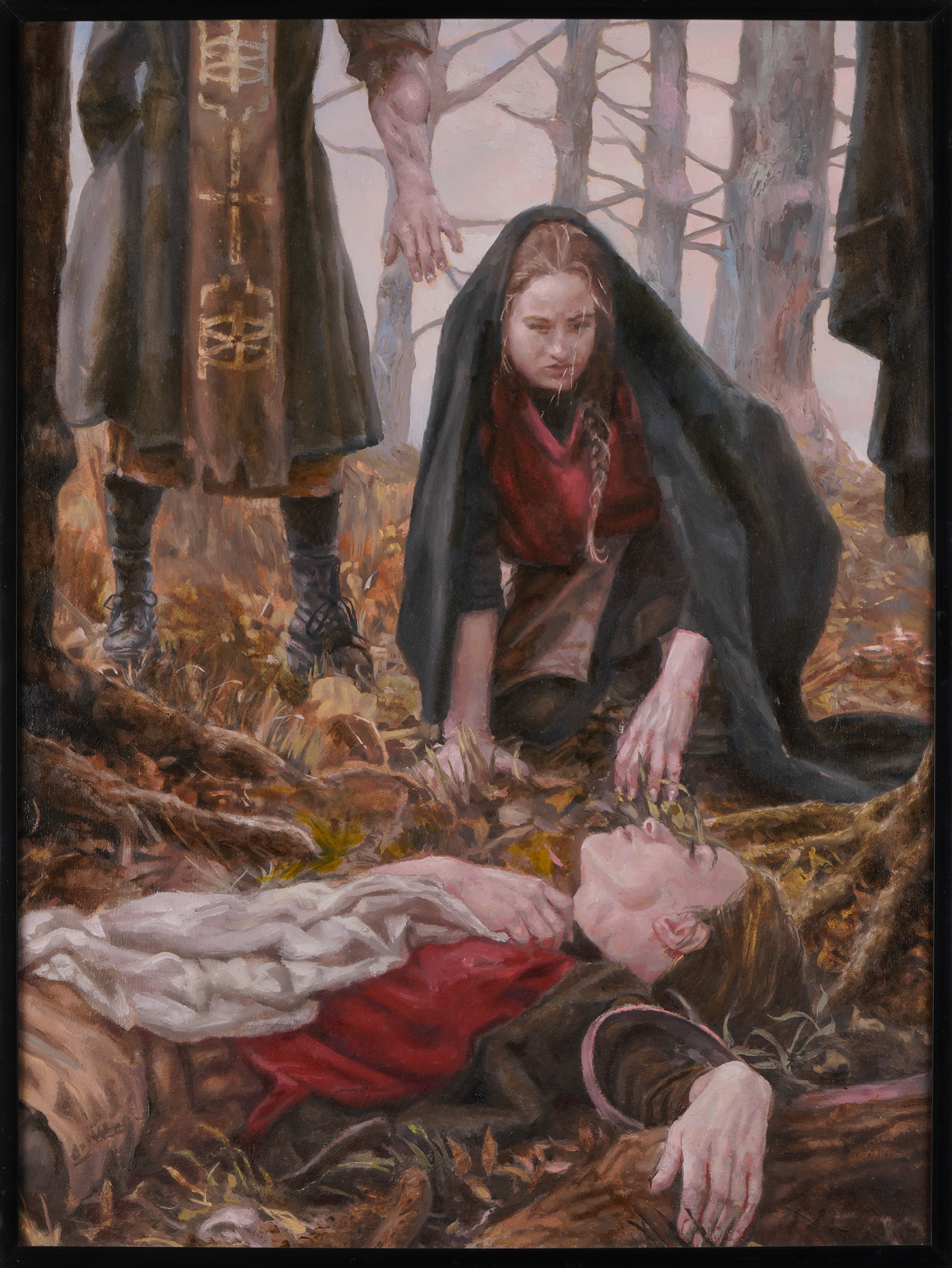 Letting Go is based on my reflections on the topics of dreams, sacrificing an old identity for a new and foreign one, and how painful these decisions can be. Here we see a religious devotee mourning the loss of another follower, while a more alien humanoid attempts to guide her elsewhere.